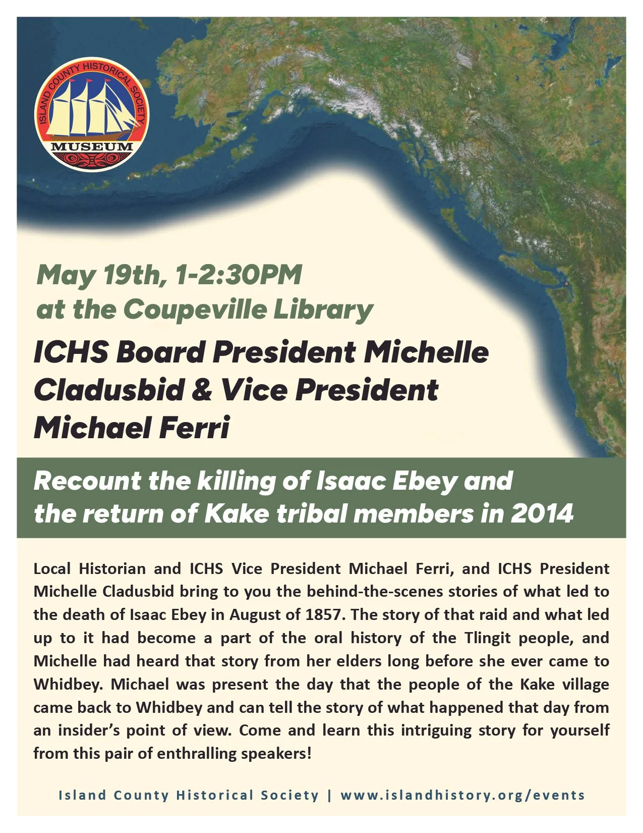 Local Historian and ICHS Vice President Michael Ferri, and ICHS Board President Michelle Cladusbid bring to you the behind-the-scenes stories of what led to the death of Isaac Ebey in August of 1857. The story of that raid and what led up to it had become a part of the oral history of the Tlingit people, and Michelle had heard that story from her elders long before she ever came to Whidbey. Michael was present the day that the people of the Kake village came back to Whidbey and can tell the story of what happened that day from an insider’s point of view. Come and learn this intriguing story for yourself from this pair of enthralling speakers!