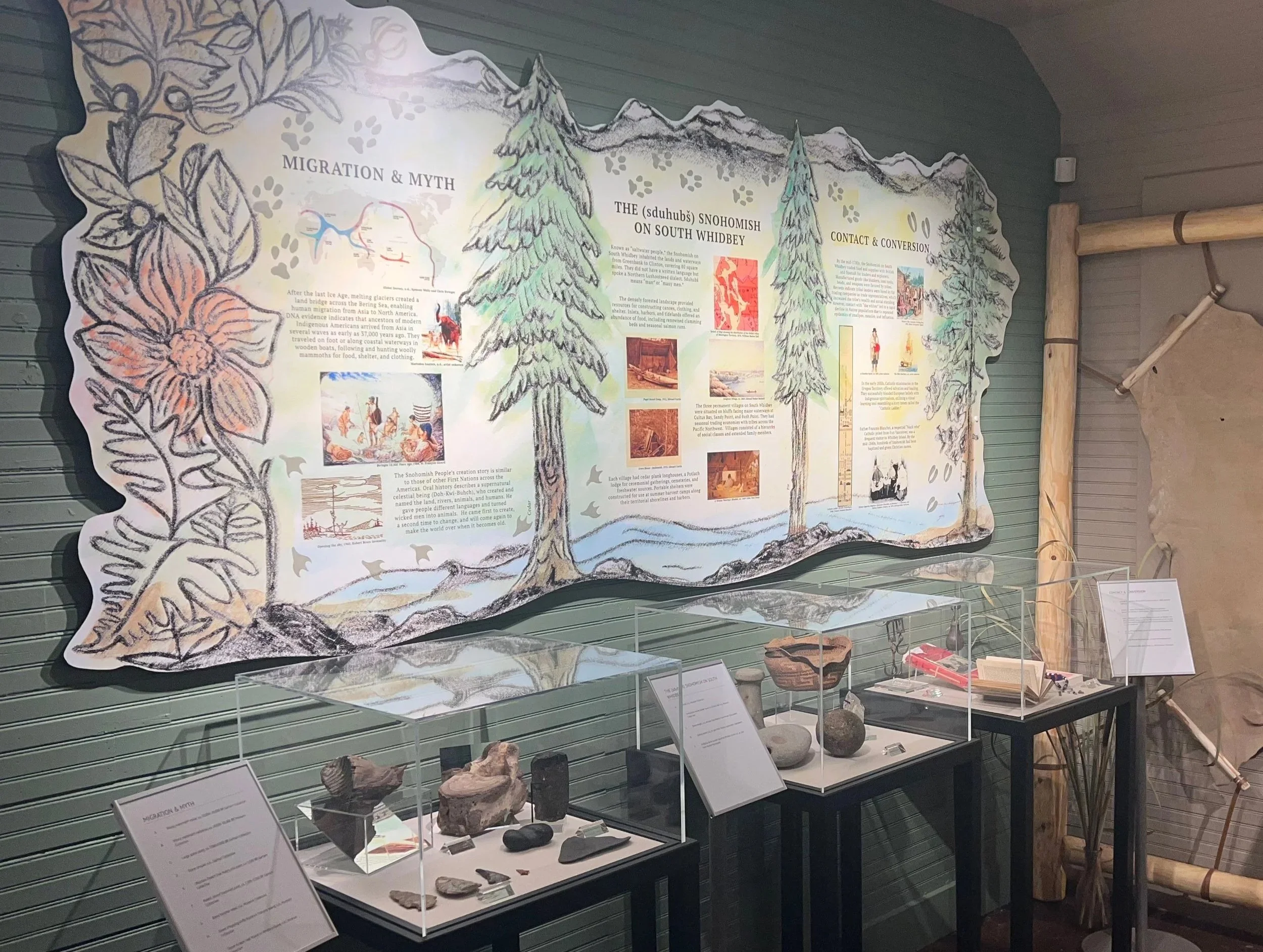 Experience the new cultural arts gallery, which shares the history of the Coast Salish (sduhubš) Snohomish People of South Whidbey. Travel from time immemorial, through contact with Europeans and the signing of the Treaty of Point Elliot, to the reviving of cultural traditions today.